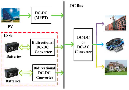 A typical islanded DC microgrid with various sources and loads is shown in Figure 1. The system consists of PV power generation units, energy storage systems (ESSs), power electronic converters and different kinds of loads.