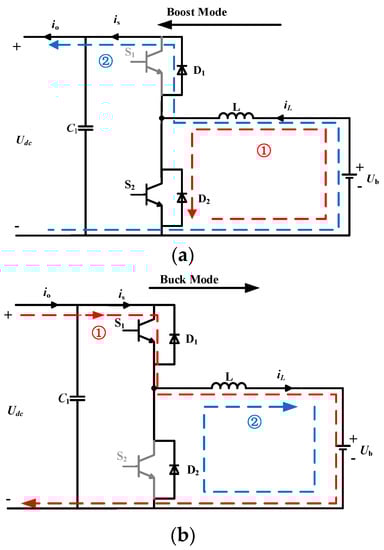 The operational principle of the bidirectional DC/DC converter. (a) Boost mode. (b) Buck mode.