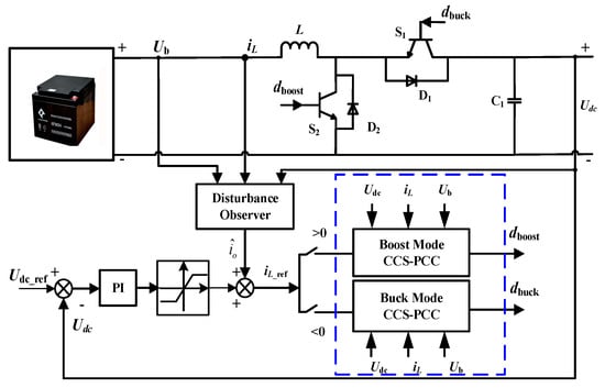 A robust CCS-PCC strategy for a bidirectional DC/DC converter based on a nonlinear disturbance observer (NDO) is proposed in this paper. The block diagram of the proposed control method is shown in Figure 3. Udc-ref represents the DC bus voltage reference, iL-ref represents the inductor current reference and represents the observation value of the equivalent load current.