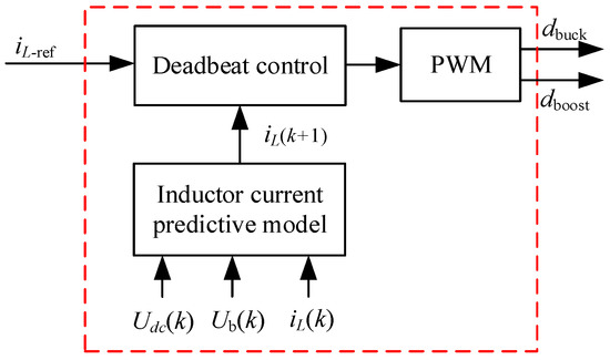 The control block diagram of the CCS-PCC controller proposed in this paper is shown in Figure 4. The inductor current prediction model is established by the mathematical expression of the inductor current of the bidirectional DC/DC converter. The reference value of the inductor current iL-ref is obtained from the voltage outer loop. For the bidirectional DC/DC converter, the measurable variables are the inductor current iL, the battery voltage Ub and the DC bus voltage Udc. The predictive value of the inductor current iL(k + 1) can be obtained by an inductor current predictive model. Then, the predictive value of the control variable is obtained according to the idea of deadbeat control. The predictive current model in different modes can be deduced according to the bidirectional DC/DC converter mathematical model.