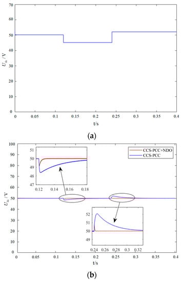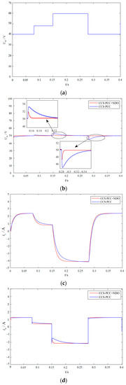 To verify the performance of the system with the PV output voltage fluctuation, the comparative results between the conventional CCS-PCC method and the proposed CCS-PCC+NDO method are given in Figure 9.