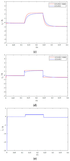 To verify the performance of the system with a step load, the comparative results between the CCS-PCC method and the proposed CCS-PCC+NDO method are shown in Figure 8. Figure 8a shows the DC bus voltage with a step load. The load steps up from 40 Ω to 20 Ω at 0.12 s suddenly, and the load steps down from 20 Ω to 60 Ω at 0.24 s. Figure 8b shows the controlled DC bus voltage by using CCS-PCC and CCS-PCC+NDO. Figure 8c,d show the inductor current and the equivalent load current, respectively. Figure 8e shows the observation value of the equivalent load current. These results show that the CCS-PCC+NDO method has better disturbance rejection capability and dynamic performance.