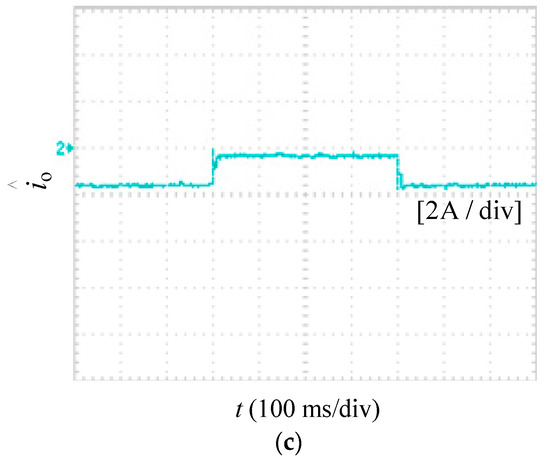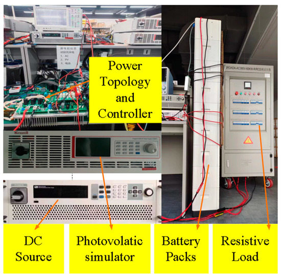 To verify the performance of the current predictive control method based on the nonlinear disturbance observer proposed in this paper in practical application, taking DSP28346 as the kernel, a photovoltaic energy storage system experimental platform with a bidirectional DC/DC converter was built. The experimental platform is shown in Figure 10. The system hardware consists of a DC source, batteries, a bidirectional DC/DC converter, resistive loads and an oscilloscope. The DC source is used to analog the output voltage of PV in different modes. The bidirectional DC/DC converter is the core of the system. Batteries can work in a charge state and a discharge state, and the batteries’ discharge current is positive in the experiment. The system experiment parameters are shown in Table 2.