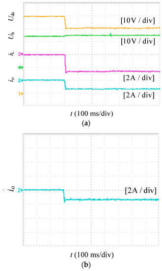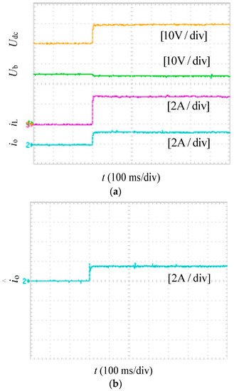 When the light intensity is lower or the temperature is higher, the PV output voltage after the maximum power is lower than the DC bus voltage reference value. It can be seen from Figure 11a that the DC bus voltage can be increased and the stability of the DC bus voltage can be ensured by the proposed control method. The batteries’ voltage is constant, basically, and the batteries work in the appropriate discharge state. The inductor current is positive. Figure 11b shows the observed value of the equivalent load current can track the actual current accurately.