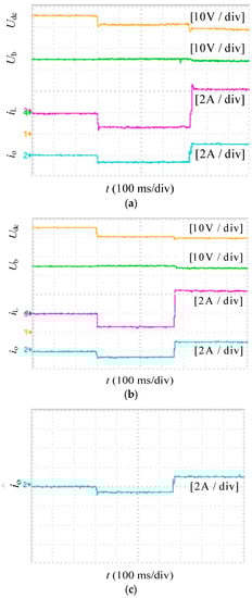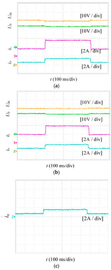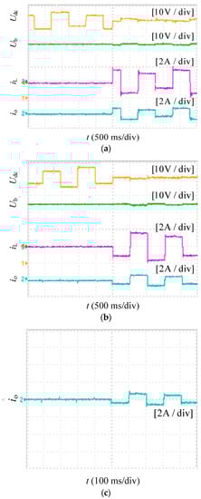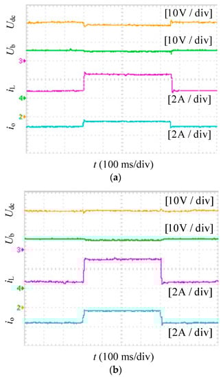 Figure 14 shows the system output waveforms by using CCS-PCC and CCS-PCC+NDO in buck mode. The batteries work in the charge state when the bidirectional DC/DC converter works in buck mode. The sudden load steps up from 40 Ω to 20 Ω, and then steps down from 20 Ω to 40 Ω.