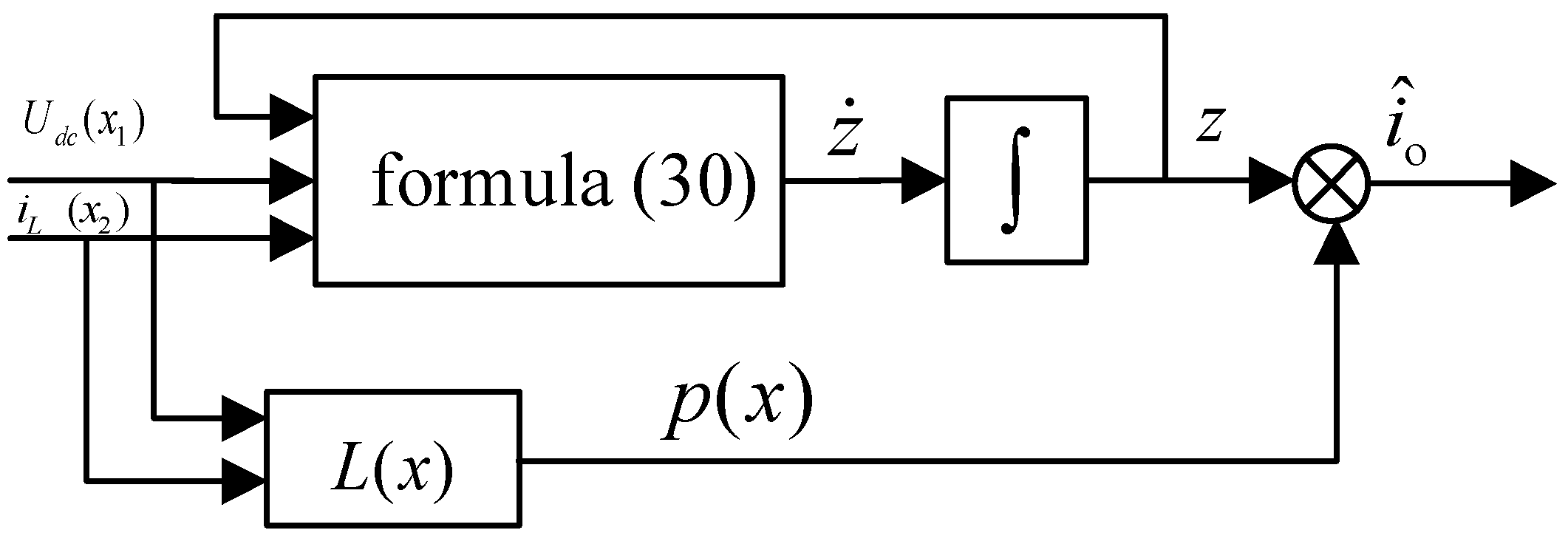 A nonlinear disturbance observer, which is able to estimate the disturbance term , is designed as follows [38,39]. Defining L(x) as observation gain matrix, the estimation value of the equivalent load current can be derived from (23) as shown in Equation (25):