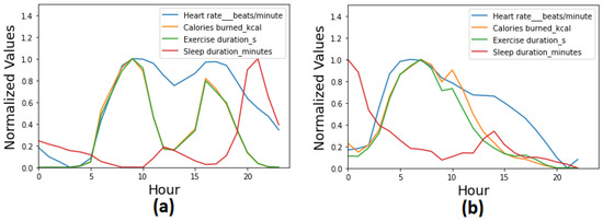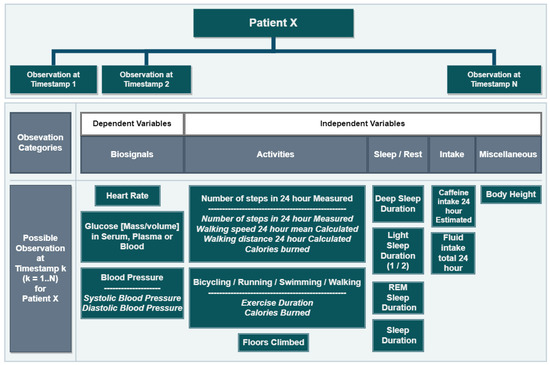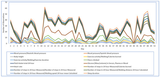 FHIR observations can be as simple as a single record or compound, combining several observations. For example, heart rate measures are simple observations, while walking activities are compound, including the walking duration and calories burned. Observations in the dataset concerned biosignals (25%), activities (9%), sleep/rest (65%), and food/liquid intake (1%). The dataset included both independent and co-dependent variables as simple or compound observations, collected at different times of the day for a variable period of time; see Figure 1.