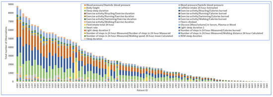 To sum up, the analysis of the dataset highlighted four types of irregularities in relation to (1) the number of observations per patient and their type, (2) the duration of the data collection per patient, (3) the period of continuous recording and gaps, and (4) the number of observations per day. For instance, the number of produced observations per patient varied greatly with 18 of 85 (21.18%) scoring above the median of 4k total observations; see Figure 3.