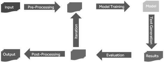 The process in Figure 6 is iterative and articulated into (1) pre-processing, (2) model training, (3) Text Generation, and (4) evaluation, as described in the following sections. The results were evaluated at the end of each cycle; the model hyper-parameters were updated, and the model was retrained until evaluation reached a target BLEU score [42] and an overall acceptable 2-sample Kolmogorov–Smirnov test (KS test) [34] result.