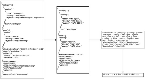 The values of effectiveDateTime, effectiveTiming, and valuePeriod encode the time of the observation. Before the optimisation steps described above, these values were stored in a time index recording the patient’s unique identifier ID, the observation number N, and the elapsed time in seconds t. ID N was then attached at the head of the stringified JSON representation.
