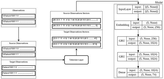 Similarly, the execution of the model training was implemented in Python using the Tensorflow Keras library. The model architecture consisted of three hidden layers: an Embedding Layer and two GRU layers (see Figure 8). The sparse categorical loss function was used to minimise the loss. The output from the training of the model was the Tensorflow logits [], which were used to generate the predictions. The model was designed to retain up to 187 characters at each step. If the observations were less than 187 characters, the sequence was padded with zeros in the tokenisation step.