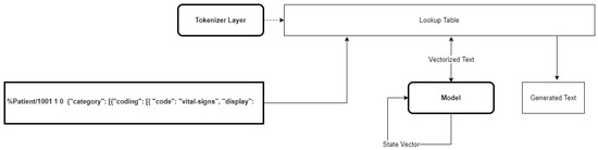 The DSG considers the training data as sequences of characters and documents, rather than time series, for instance an observation about a heart condition followed by observations about physical activities such as step counts. As such, the developed solution uses Recurrent Neural Networks, as described in the rest of this section.