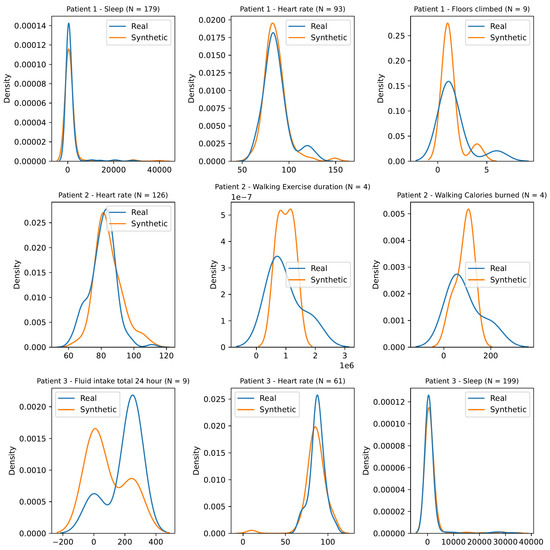 As per the previous solution, we used the 2-sample Kolmogorov–Smirnov test (KS test) [34] for a sample of patients. For a particular observation category or sub-category, we tested the null hypothesis that the seed and the synthetic data were generated from the same probability distribution. We determined the critical KS value using a significance level of 0.05 for each instance, and we did not reject the null hypothesis if the calculated KS value was less than the critical KS value. The results reported in Table 6 and the distributions shown in Figure 10 indicated that the model can be used to generate synthetic data with a similar probability distribution as the seed.