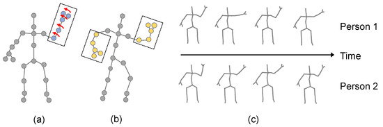 Understanding and analyzing human motion requires the examination of human movement patterns and the relationship between body parts. The interaction between different body parts is a critical aspect of various types of movements, such as walking, running, jumping, and throwing. The human body is organized as an assembly of body parts linked through joints, with all body parts controlled by the brain. While the precise mechanism through which the brain generates and controls movements is unclear, specific effects can be observed. As depicted in Figure 1a, joints within the same part of the body tend to exhibit similar movement patterns. For instance, the shoulder joint and elbow joint both move similarly as they are both situated in the upper arm and connected to the same muscles. The knee and hip joints move similarly as they are situated in the lower body and connected to the same muscles. In Figure 1b, coordination involves both symmetrical and asymmetrical coordination of limbs. A crucial dynamic effect in human walking is that limb movements are nearly synchronized. The limbs move in a rhythmic pattern, with the arms and legs swinging in opposite directions almost simultaneously. This synchronized movement helps maintain balance and enables the body to move forward more efficiently. In Figure 1c, each person’s movement patterns are unique. Due to differences in age, gender, health, and level of physical fitness, these patterns can vary greatly between people. Action recognition may be inaccurate as a result of predetermined topology.