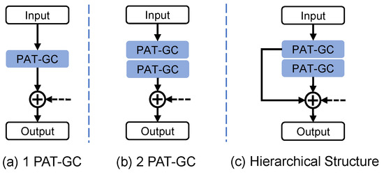 (a)One PAT-GC block. (b) Two PAT-GC blocks. (c) Hierarchical Structure. The upper PAT-GC block is used for the coarse scale parts and the lower one is used for the fine scale parts. The dashed arrows represent the features of other parts.