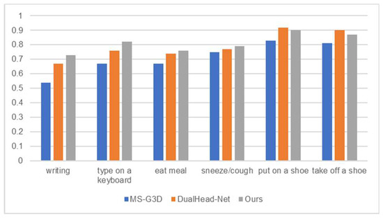 The experiments were conducted using the Pytorch1.6 deep learning framework on four GTX1080Ti GPUs. Stochastic gradient descent (SGD) was employed with a momentum of 0.9 and weight decay of 0.0001. The model was trained for 50 epochs on NTU-RGB + D 60 and 65 epochs on NTU-RGB + D 120, respectively. The initial learning rate was set to 0.1, decreasing by a factor of 0.1 at epoch 35. For these two datasets, the batch size was set to 64, and input preprocessing was conducted in accordance with previous research [19]. For Kinetics Skleton 400, the batch size was set to 128, with a learning rate of 0.1 that decreased by a factor of 0.1 at epoch 45. The model was trained for a total of 80 epochs. To improve training stability, the learning rate gradually increased during the first 5 epochs in all experiments.