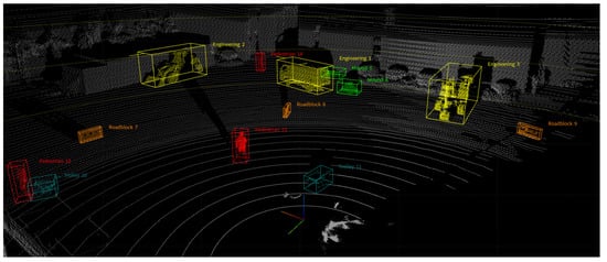 Section 4.1, the PointPillars algorithm is used to detect roadblocks and work objects to obtain the position and attitude of roadblocks and work objects relative to the vehicle. The actual detection effect is shown in
