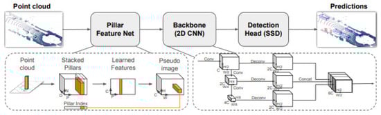 7]. The main principle of the VoxelNet algorithm is to voxelize the 3D point cloud, then extract the features of the point cloud in each voxel, and finally, extract the voxel features into local features using the voxel feature coding network and process the local features using the 3D convolution neural network, so as to obtain the deep semantic features and their corresponding geometric space representation. The disadvantage of this algorithm is that the point cloud is sparse, and the voxels of the extracted features are empty, which will greatly reduce the computational efficiency and affect the real-time performance of the entire environment perception system. The SECOND algorithm adds a sparse convolution layer on the basis of VoxelNet, which solves the problem of point cloud sparsity to a certain extent, and improves the reasoning speed of the algorithm. However, because the VoxelNet voxel-by-voxel feature method is still used, its deployment in the actual system still cannot meet the real-time requirements. As a common point cloud sensing algorithm in the industry, PointPillars uses the reduced-dimension convolution method to improve the reasoning speed. The feature is that only two-dimensional convolution can achieve end-to-end 3D point cloud learning and target detection.
