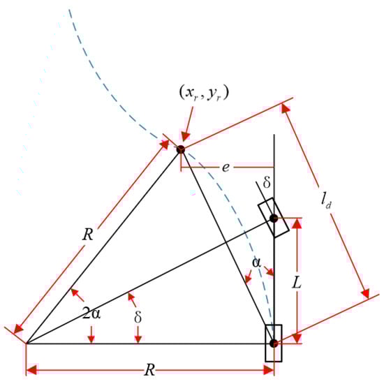 After calculating the radius of curvature of the tracking path, the front wheel angle of the vehicle can be further calculated by using the geometric relationship. The specific derivation process is shown in Equations (