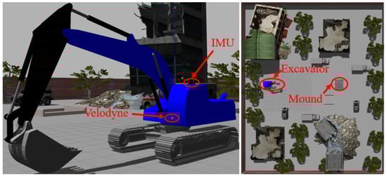 Figure 10, excavators commonly used in engineering operations are modeled and their simulation environment is built. In addition, the Velodyne lidar and IMU are deployed on the excavator model to enable it to collect environmental information and vehicle movement information.