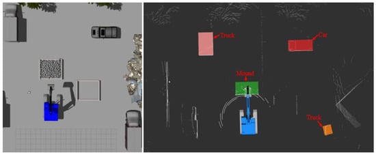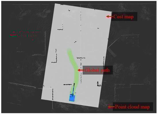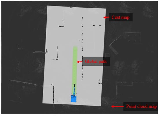 Figure 12. Among them, the point cloud map is used to match the observation point cloud of the lidar carried by the vehicle to obtain the vehicle localization information in real time. The grid map serves as the prior information of hybrid A* for path planning, and provides a basis for hybrid A* to plan a safe and reliable global path.