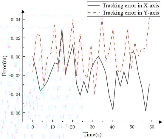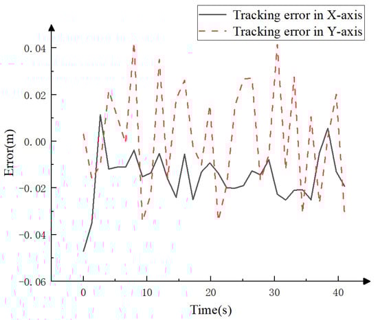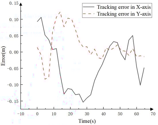 Figure 29. The analysis shows that the improved pure pursuit algorithm proposed in this paper has excellent performance in real vehicle motion control, and the tracking trajectory is basically consistent with the reference global path planned by hybrid A*. The maximum tracking error in the X-axis direction is 0.154 m, and the average tracking error is 0.069 m; the maximum tracking error in the Y-axis direction is 0.123 m, and the average tracking error is 0.037 m, which meets the requirements of actual construction machinery for motion control accuracy. Moreover, the improved pure pursuit algorithm proposed in this paper can not only be applied to tracked construction machinery but also be adjusted in combination with the kinematics model of other construction machinery to complete the motion control of various construction machinery.
