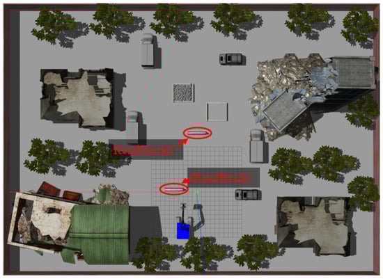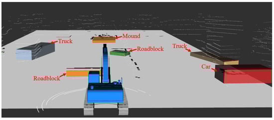 Place two roadblocks between the tracked construction machinery model and the work object to test the autonomous obstacle avoidance function of the construction machinery, as shown in