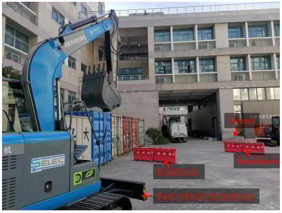 In the real vehicle test, the position and attitude of the object detected by the PointPillars algorithm relative to the whole vehicle are still used as the target point of path planning, the current position and attitude of the whole vehicle are used as the starting point of path planning, and two roadblocks are set between the starting point and the target point, respectively, to verify the automatic operation path finding and autonomous obstacle avoidance functions of the whole vehicle driverless system. The actual test scenario is shown in