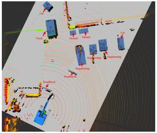 In this paper, SUSTechPoints is used to label the objects in the 3500 laser point cloud frames collected and divided above. This data set was created according to the standards of the Kitti data set. A total of 7153 mounds, 7314 water horses, 5234 carts, 2245 wheel excavators, 2371 loaders, 1945 trucks and 6845 pedestrians are labeled. Among them, the mound anchor has a width, length, and height of (1.88, 2.50, 1.00) m with a z center of −1.15 m. The water horse anchor has a width, length, and height of (0.34, 1.42, 0.75) m with a z center of −1.275 m. The cart anchor has a width, length, and height of (1.41, 0.77, 0.86) m with a z center of −1.22 m. The construction machinery anchor has a width, length, and height of (6.13, 2.47, 2.99) m with a z center of −0.15 m. Finally, the pedestrian anchor has a width, length, and height of (0.72, 0.71, 1.83) m with a z center of −0.735 m. Each object box labeled in this paper strictly conforms to the relevant point cloud labeling standards, and is attached with the object ID number to facilitate the deployment and application of the subsequent target tracking algorithm. The labeling effect is shown in