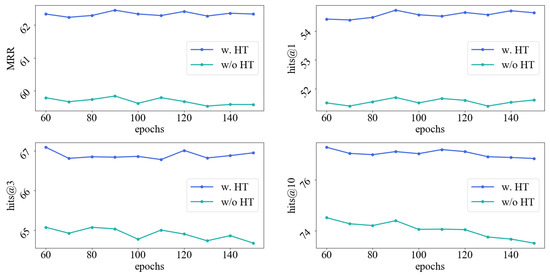 To verify the effect of Householder transformation, we design a variant of HTTR that removes the Householder transformation module from the model, and conduct further experiments on ICEWS14, using the validation set every 10 epochs. The model tends to converge at 150 epochs. In order to express the comparison more intuitively and clearly, Figure 3 only shows the results of the 60–150 epochs. The results show that the Householder transformation module significantly improves the performance of the model and that the improvement is basically consistent in all four metrics, indicating that HTTR can model temporal information well and is stable.