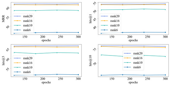 In order to verify the effect of the rotation dimension on model performance, we conducted a detailed analysis on ICEWS14 (Figure 4). We set the training epochs to 300, verified it every 60 epochs, and the other parameters were the same as the previous main experimental settings. Then, we set the rank to 6, 10, 16, 18, and 20, respectively for verification. On ICEWS14, HTTR tended to converge after 100 epochs of training, so the broken lines in the chart were relatively stable. When the rank was set to 16 and 18, the two lines were very close, so we omitted the case of rank18 from the figure. On the whole, with the increase in rank, the performance of the model improved, and the improvement amplitude of the four metrics was similar. When the rank increased from 6 to 10, the performance of the model improved. When the rank continued to increase to 16, the performance coulld still be greatly improved. However, when the rank further increased from 16 to 18 and 20, the training time improved greatly, but the improvement was not obvious. This indicates that, within a certain range, the model performance could be improved by increasing the rotation dimension.