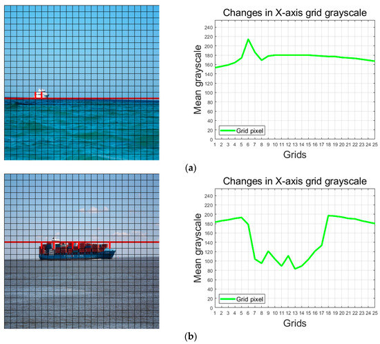 Horizontal line detection is essential to detect maritime objects. GLC approximates the position of the horizon using the greyscale value of grids as shown in Figure 6. After the process described in Section 3.1 (i.e., Figure 6a), the GLC first sums the greyscales of every X-axis grid and generates the average figure for it: for example, one row colored in red in Figure 6b. The grid value of the grids in the X-axis is merged, so that every row has one average value as shown in Figure 6c. The line having the highest variation is assumed to be the point between the sky and the sea and detected as a horizontal line. The average greyscale is quickly calculated because only simple integer values are used. As a result of Equation (2), the horizon colored in red in Figure 6c is detected, since GLP assumes that the point having the largest difference is the position of horizon [38]. The greyscale difference between sky and cloud is less distinct than the difference between sea and sky, so that GLC does not easily detect a horizon line in the sky area.