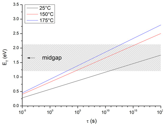 In this investigation, the maximum temperature of the diode package is considered. Because the TOP-3 package can withstand up to 175 °C, emission times focusing on room temperature (RT), on a range between 150 °C and 175 °C are studied. The emission time (Figure 3) τ shows a significant temperature-dependent kinetic. For example, τ is estimated to be 105 s for near-midgap states at 175 °C, whereas it is around 1015 s at RT. A study focusing on relatively shorter time constants (τ < 104 s), an accelerated carrier “de-trapping step” for 2 h at 150 °C is performed, enabling trapping levels to empty ~1.2 eV below the conduction band.