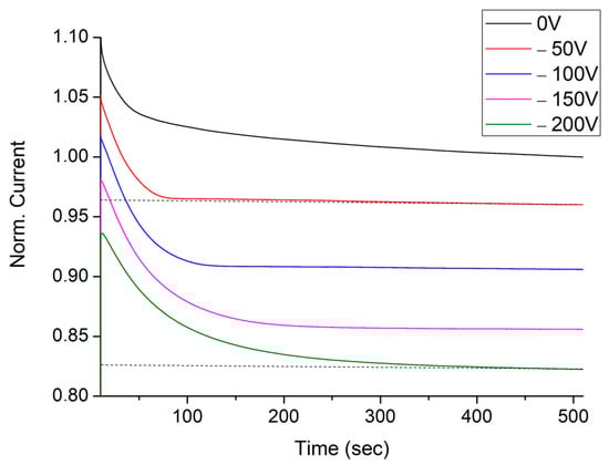 Using the vortex tube, Figure 4 presents the results obtained at 0 °C with the previous setup. Significant variation of the monitored current versus time can be observed with an apparent time constant depending on the amplitude of the voltage stress. For example, after a stress of −50 V the current stabilize for a shorter time (100 s) than after a stress of −200 V (400 s).