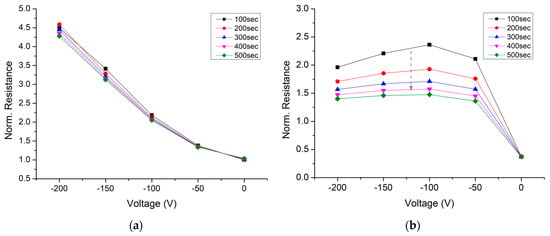 (a) Dependence of the resistance on trapping voltage at 25 °C for different time constant (t = [100 s; 500 s] on the RP; (b) Dependence of the resistance on trapping voltage at 125 °C for different time constant (t = [100 s; 500 s] on the RP.