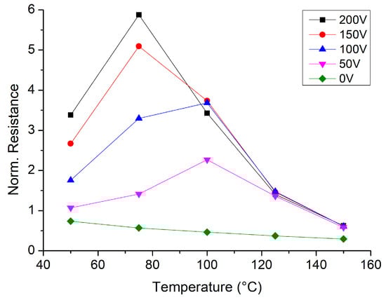 Dependence of resistance on trapping voltage and temperature at 250 s.