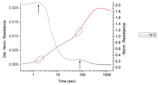 In order to obtain an accurate inflection point, the normalized resistance is derived and smoothed. For example, in Figure 8, the two peaks give a closer estimation of the different time constant values for the measurements at 75 °C.