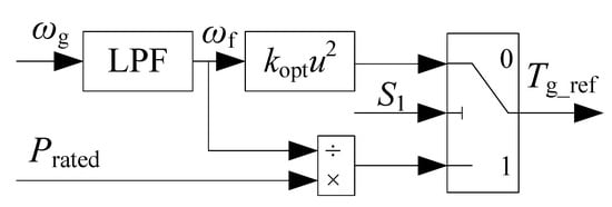 When S is 0, the torque control operates in the MPPT region, and the method can be shown in Equation (1). In this control region, pitch control is prohibited. When S is 1, the torque control operates in the constant power control region, and the method can be shown in Equation (2). In this control region, the pitch control is activated. Thus, the torque control can be illustrated in Figure 2.
