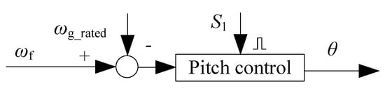 When the pitch control is activated (S is 1), the pitch control would be implemented if the filtered speed exceeds the rated speed. The pitch control method is the PI control method based on gain scheduling shown by Equation (3). Moreover, the pitch control block diagram can be seen in Figure 3.