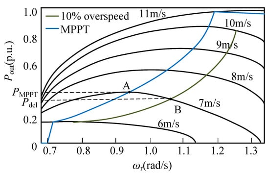 In order to continuously provide frequency support, de-loading operation is required. This can be achieved through over-speed control by appropriately shifting the WT operating point to the right of the MPPT curve, as illustrated in Figure 4. The operating point speed of the green curve is higher than that of the MPPT operating point, resulting in a lower output power P corresponding to the green curve compared to P.