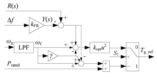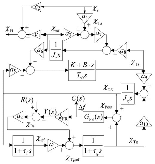 The small-signal model of the filtered generator speed can be represented as Equation (19). To simplify the expression, denote shown in Equation (20) as the input of the WT under the frequency regulation method based on over-speed control. Besides, the small signal of the WT control methods can be shown as Equations (21)–(23) based on Equations (3)–(5).