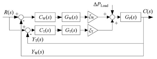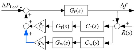 To investigate the effectiveness of WT’s frequency regulation in reducing frequency dips under various operating conditions (wind speed, , and ), it is necessary to analyze the response characteristics of the closed-loop transfer function. The closed-loop block diagram of the control system is shown in Figure 11, and the response characteristics can be evaluated using Equation (30).