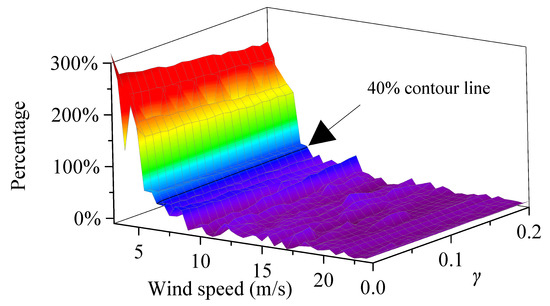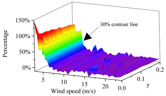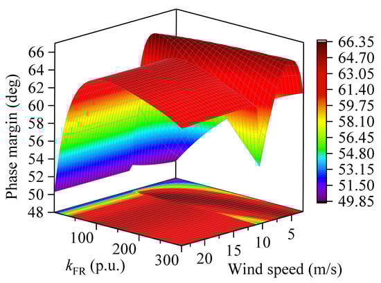 Based on Equation (29), the phase margins of the control systems with different wind speeds and frequency regulation coefficients are calculated under different de-loading factors . Among them, the ranges from 20 to 300. The wind speed ranges from 3 to 24. Figure 10 shows the phase margin when the is 0.05.