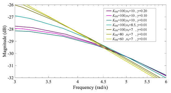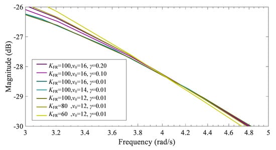 Partial enlargement of the Bode diagram of under different parameters below rated wind speed.