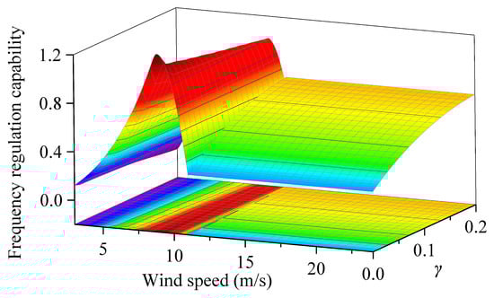 The frequency regulation capability is depicted in Figure 16. As shown, the wind speed range corresponding to the maximum frequency regulation capability is between 7.5 m/s and 10.5 m/s.