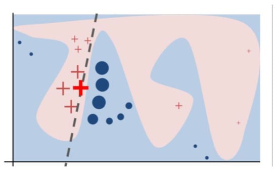 Figure 2 illustrates an interpretable area in the form of a concept map. The blue and red regions represent two categories of a complex classification model. Samples predicted within the red region are classified as “+”, while those in the blue region are classified as “●”. It is difficult to use a linear model to explain the behavior of the entire area of a complex model. However, if we focus on a specific area, a linear model can be used to fit the regional behavior of the complex model in that area. For instance, the thick red cross sample in Figure 2 can be utilized to interpret the deep learning model regionally by taking perturbation samples around it, classifying these samples using the original complex model, and training a simple linear model, such as the black dashed line. This enables the use of locally interpretable models for regional interpretation of deep learning models.