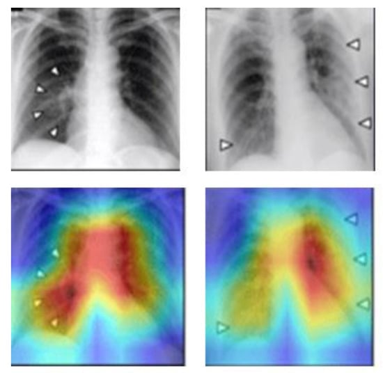 CAM is a CNN visualization technique introduced by B. Zhou et al. at the CVPR 2016 conference []. It was originally proposed to solve the problem of weakly supervised learning, where CNNs are capable of detecting and localizing objects even if they lack labeled location information during training. This ability is lost when the network uses the Fully Connected Layer, but replacing it with the Global Average Pooling (GAP) layer preserves the localization ability and reduces the overall network parameters. The CAM method can visualize the CNN network’s position of interest in classification and generate a heatmap for the overall object localization of the network. By combining CAM and GAP, the CNN can classify the image and locate specific areas related to the classification. For example, Figure 3 demonstrates the CAM schematic, where the CAM helps to identify the critical regions that need to be detected to diagnose COVID in the chest X-ray images.