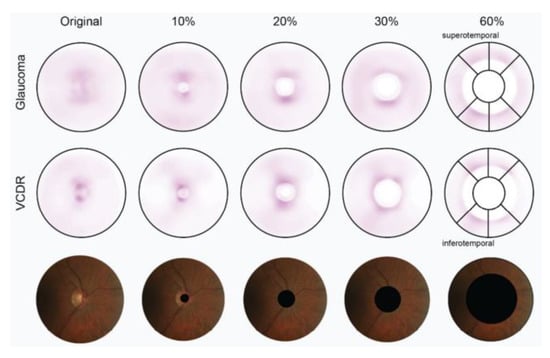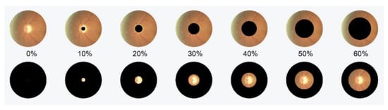 In 2021, R. Hemelings et al. [] proposed another CNN-based glaucoma detection system using ResNet50 architecture, which aimed to address the lack of interpretability and decision transparency in deep learning glaucoma detection studies. The authors employed different cropping strategies to select 10–60% of the area centered on the ONH for cropping and removal, and the schematic for this cropping strategy is shown in Figure 4. Although most deep learning glaucoma detection studies exhibit high sensitivity and specificity, their lack of interpretability limits their clinical contribution.