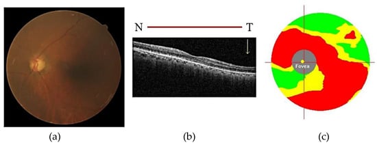 The NTUH dataset used in this paper was retrospectively collected by the NTUH team and contains two types of images for each patient: funduscopic images and optical homogeneous tomography (OCT) images. The OCT images provide information on the thickness of the RNFL layer under the optic disc area and the thickness of the GCC layer under the macula area. Figure 6 shows an example of the dataset, where (a) is the funduscopic image, (b) is the OCT image corresponding to (a), and (c) is the thickness information of the GCC layer corresponding to (b). The funduscopic image and the GCC layer thickness information were primarily used for the research experiment.