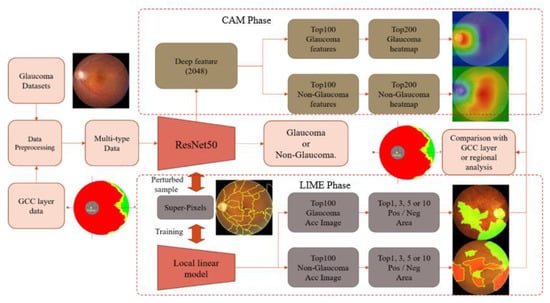 Also in 2020, F. Li et al. [] proposed a CNN-based glaucoma detection system that used ResNet101 architecture and incorporated patient history information in the final fully connected layer. The model’s main concerns were identified using heatmaps generated by blocking tests, which revealed that the model focused on the edge of the ONH in non-glaucoma cases and on the area of RNFL defects above and below the ONH in glaucoma cases.
